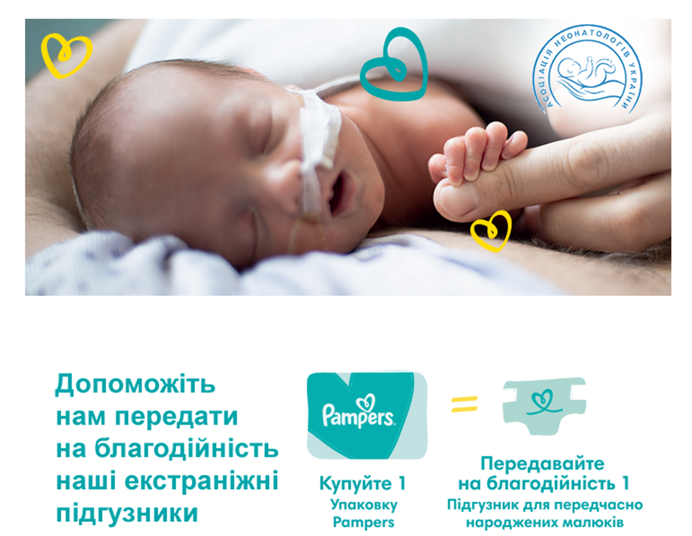 * З кожної проданої упаковки підгузників ТМ Pampers у мережі магазинів АТБ з 6 по 26 жовтня 2021 року, ТОВ «Проктер енд Гємбл Україна» передасть 1 підгузок для передчасно народжених малюків, які перебувають у перинатальних центрах України через Асоціацію неонатологів України.